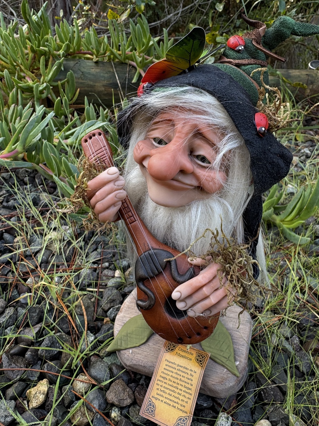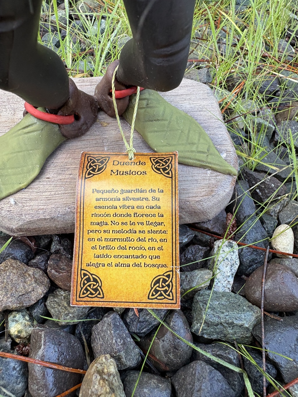 Este precioso duende viene a traerte armonia y paz a través de la vibra de ma música. Es un duende modelado en porcelana fría. Su guitarra está hecha con masilla epoxy. Mide 25cms de alto.